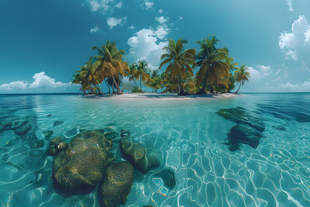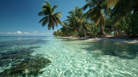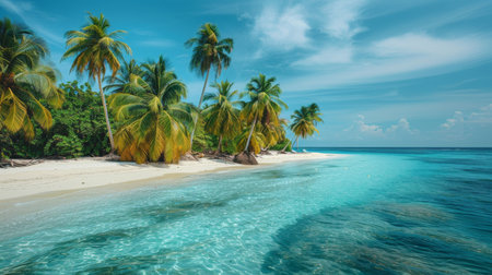 A tranquil tropical island featuring lush palm trees and pristine sandy shores. The crystal-clear waters invite relaxation and adventure in paradise.