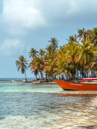 White motorboat moored on exotic coast with beautiful amazing palm trees entering the sea, Dominican Republic