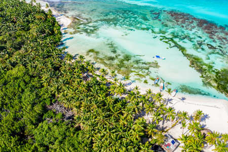 Aerial drone view of beautiful caribbean tropical island beach with palms and boats. Saona, Dominican Republic. Vacation background