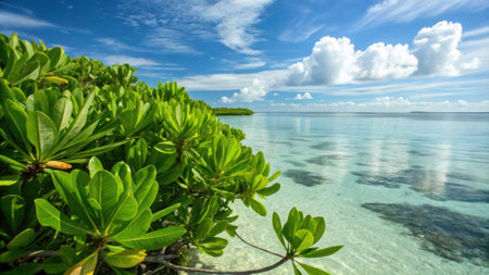 Discover a stunning coastal scene featuring calm waters, lush mangrove trees, and a bright sky, ideal for serene escapes and nature exploration in paradise.