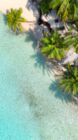 A stunning aerial view of a serene tropical island, featuring lush palm trees, white sandy beaches, and crystal clear waters, creating an ideal getaway for those seeking relaxation in nature.