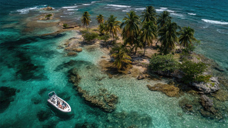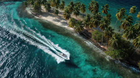 Stunning aerial view of a tropical island with palm trees, a boat gliding through clear blue water. Perfect for travel and nature enthusiasts seeking paradise.