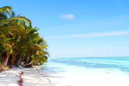 Tropical beach with palm trees and blue lagoon at Maldives