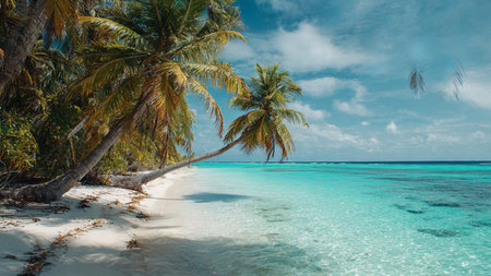 Tropical white sand beach with calm turquoise water and palm trees under blue sky, serene atmosphere for summer travel, hotel, resort, family vacation