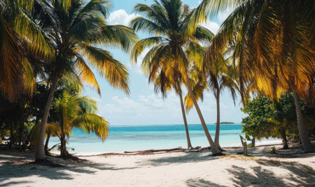 Beautiful tropical beach with white sand and clear turquoise water. Lush palm trees line shore under a bright sun