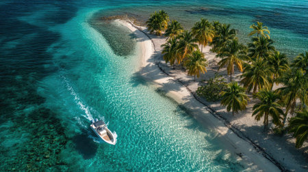 Aerial view of a tropical island with palm trees and a boat