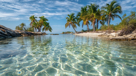 Discover a tranquil tropical beach featuring lush palm trees and crystal-clear waters. Perfect for evoking a sense of peace, serenity, and escape.