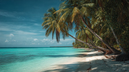 Breathtaking view of a tropical beach with crystal-clear waters, white sand, and palm trees swaying in the breeze. A perfect destination for a serene beach vacation.