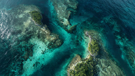 Coral reefs and atolls in the tropical sea, top view. Turquoise sea water and beautiful shallows. Philippine nature.