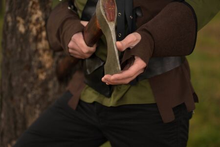Man firing with old gun wearing traditional clothes from middle ages