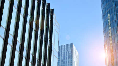 Modern glass facade against blue sky. Bottom view of a building in the business district. Low angle view of the glass facade of an office building.