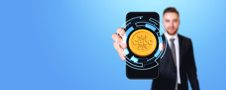 Businessman showing smartphone screen with CBDC coin, empty copy space blue background. Concept of blockchain, digital payments and central bank digital currency