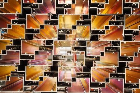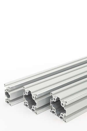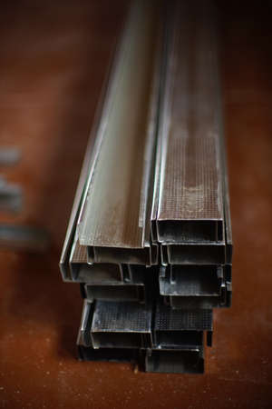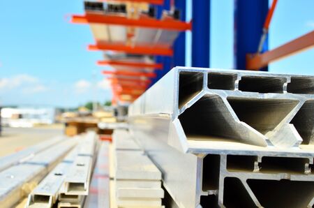 Aluminum industry extrusion at building construction site. Aluminum building system. Aluminum extrusion profile. Construction site storage with aluminum tubes. Steel extrusion. Industry material