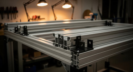 Industrial aluminum profiles with visible holes are placed on a metal workbench in a factory, with a blurred background.