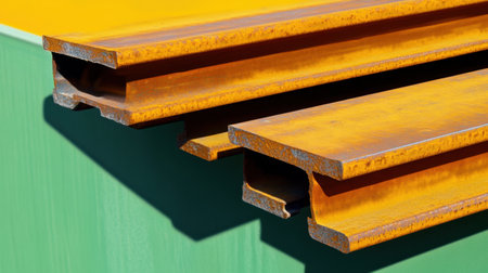A detailed close-up view of steel I-beams displaying their textured surfaces and reflective qualities, illuminated by warm light, ideal for industrial themes.