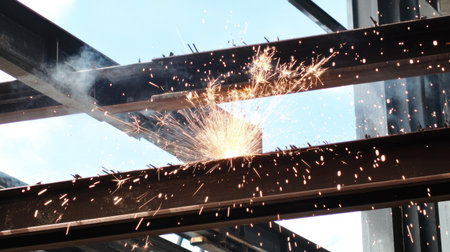 Close-up view of vibrant sparks erupting from steel beams during construction, showcasing the dynamic energy and intricate process of metalworking on-site.
