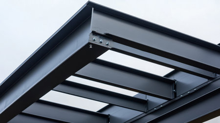 Close-up view of steel structural framework in construction, highlighting strength and design. Ideal for modern architecture themes and industrial projects.