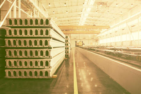 Construction site of prefabricated hall with cement pillars and concrete beams moving crane