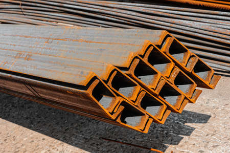 Metal profile beam in packs at the warehouse of metal products, Russia