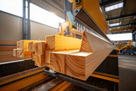 Crew members are lifting large wooden beams using cranes at a construction site. The bright daylight highlights their teamwork and safety gear. The beams will be used for structural support.