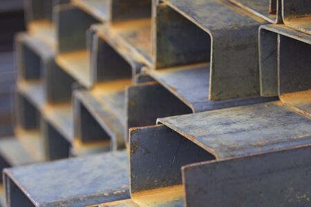 Industrial Texture Background.Stack of steel and rusty rail profiles. Rail cross-sections. Waste production.