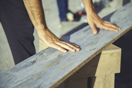 A close-up view of a home renovation, highlighting a carpenter measuring a wooden plank with a tape measure.