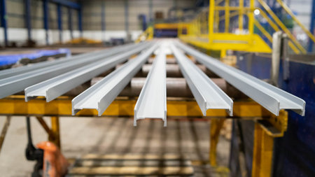Steel profiles on an assembly line undergoing rustproof treatment showcasing advanced techniques to prevent oxidation and extend product lifespan.