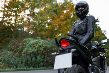 Motorcyclist in leather protective suit and black helmet sits on sports motorcycle. Biker in black rides on the road against the background of the forest. Side view