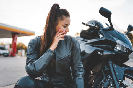 young woman dressed as a biker with a safety helmet crouching down and leaning on the front wheel of her road motorcycle