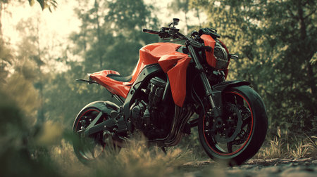 Striking orange motorcycle showcasing modern design amidst a lush green landscape.