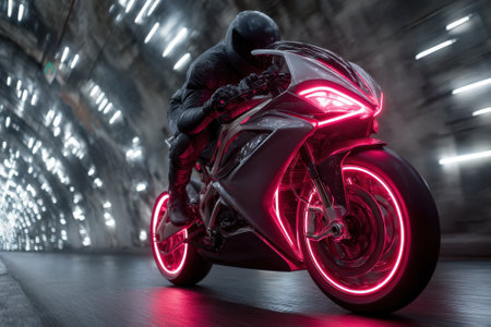 A rider on a sleek motorcycle navigates a dark tunnel illuminated by vibrant neon lights.