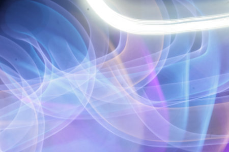 This image features dynamic light trails against a black backdrop. The swirling lines exhibit hues of white and purple. The composition highlights a sense of motion and energy, possibly suitable for designs related to technology, innovation, or visual effects. This could be used for various commercial or editorial needs.