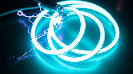 Glowing purple electricity bolts in glass tubes in a science lab.