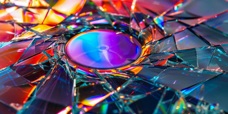 A shattered compact disc displays a spectrum of colors against a stark black backdrop. The image reveals a fractured form, with fragmented pieces suggesting destruction. This digital artwork uses a contrasting color palette and a studio-style lighting setup. Suitable for diverse design applications and conceptual projects.