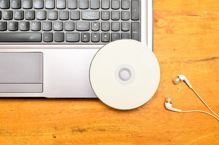 top view of dvd dish and earphone on wood background