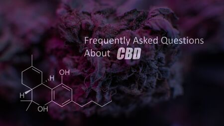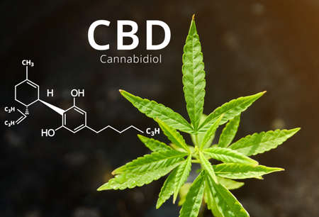 Cannabidiol (CBD) molecule formula with Marijuana background, Cannabis sativa leaves.