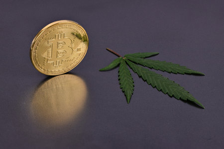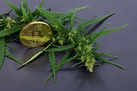 Green marijuana cannabis sprout with bitcoin isolated on black background. High resolution photo. Full depth of field.