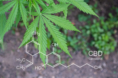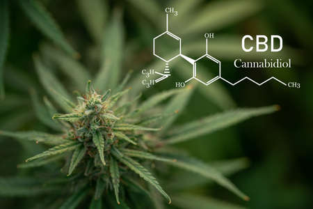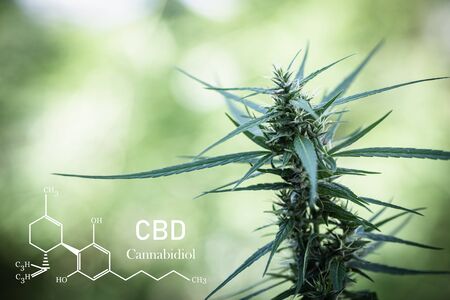 Cannabis plant growing at the outdoor farm. The texture of marijuana leaves with the text of the formula CBD (cannabidiol) on a photo. Concept of cannabis plantation for medical