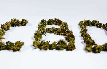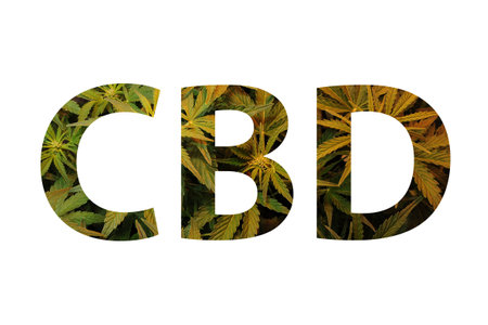 CBD letters spelled out with marijuana on white background