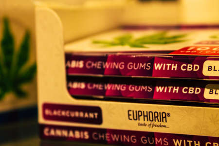 Santorini, Fira, Greece - October 28, 2021 Volcano cannabis shop located in Fira, Hemp derived CBD products is legal in Greece