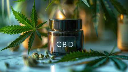 Elegant matte black CBD cream jar and a bud of hemp placed against a vibrant botanical background, highlighting the product's natural origins.