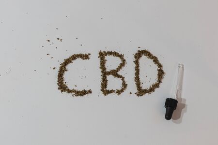 Marijuana and Cannabis Legalization, Objects on White Background, Medical and Recreational Weed, word cbd
