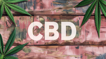Cbd sign on rustic wooden wall with cannabis leaves in corners