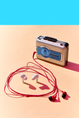 Retro walkman player with modern earbuds and wired headphones