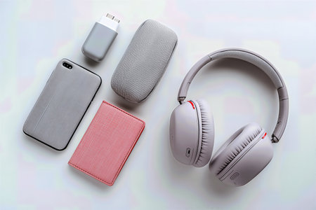 A Modern Setup Featuring Wireless Headphones, a Smartphone, and Essential Accessories