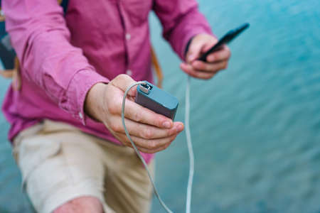 Man charges a smartphone with a portable charger. A man with a power bank in his hand on the background of the sea on a bright sunny day with clouds