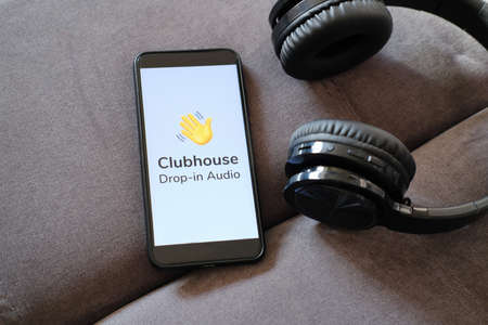 Clubhouse application view on the smartphone, controversy 2021 that hides behind the Social app. Clubhouse drop in audio chat application view on the smartphone