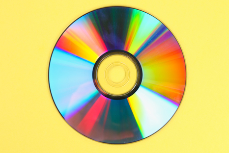 Top down view, small CD shiny / rainbow side, on yellow board, space for text on right side.