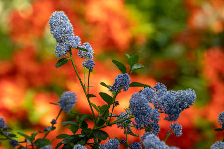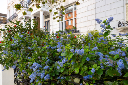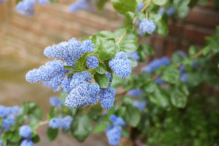 Blue flowers of eltleaf ceanothus, island ceanothus, or sland mountain lilac flowering tree in London's garden, UK in spring