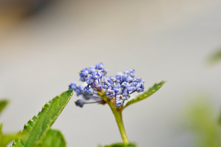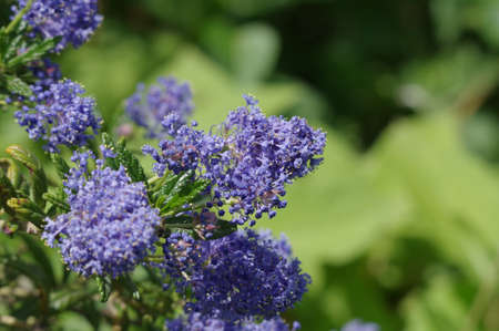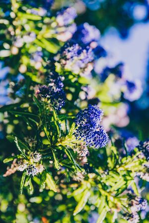 Closeup shallow depth of focus of blooming Ceanothus tomentosus Ramona lilac flowers in natural environment